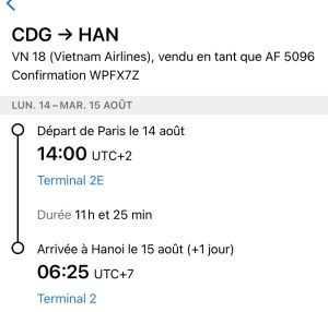 Avec le décalage horaire et la durée du vol, je pars aujourd’hui pour Hanoï.