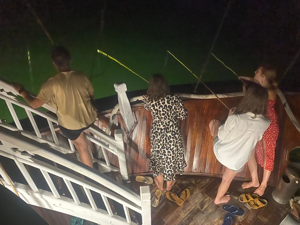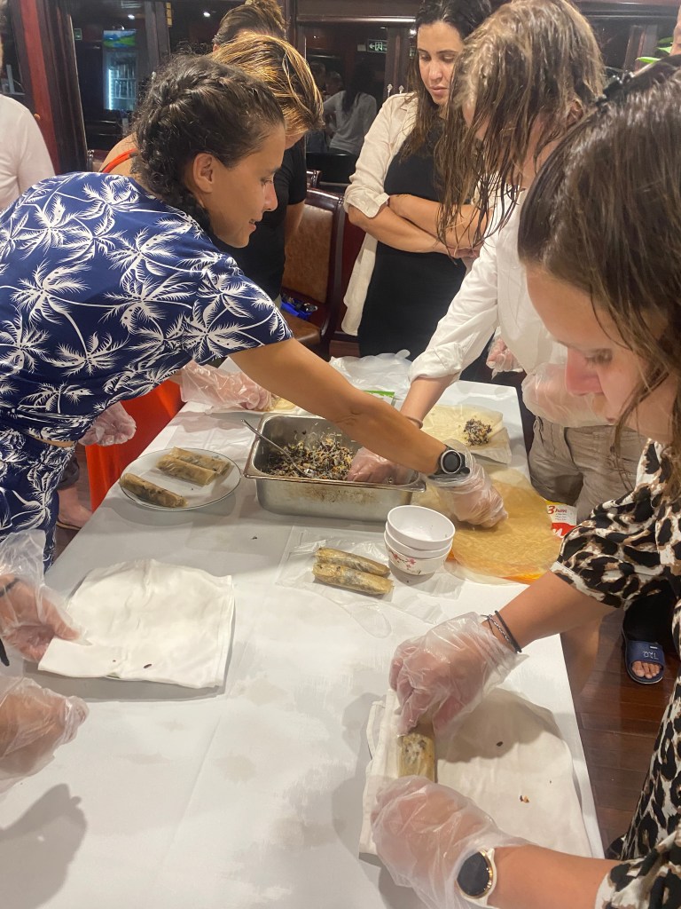 Retour sur le bateau où nous cuisinons des nems que nous mangeons pendant le dîner.