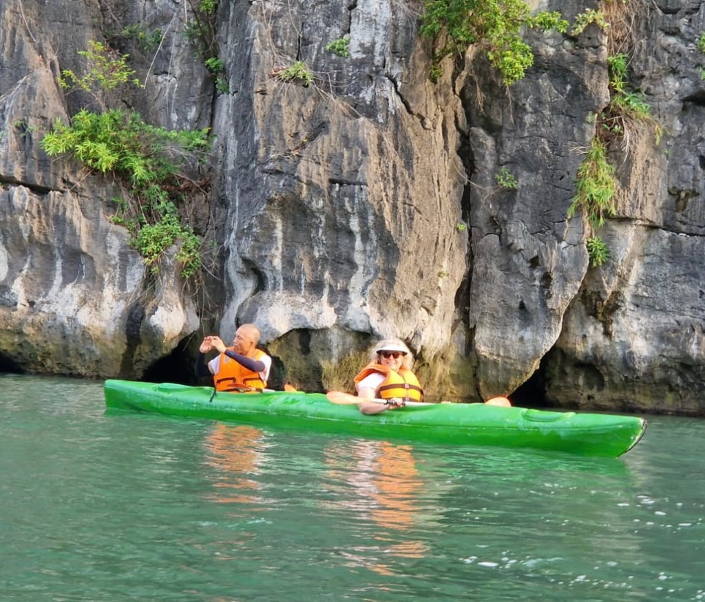 Ensuite virée en canoë kayak et baignade sur une petite plage nichée dans un rocher. Malheureusement, suite à une révolte des pêcheurs, l’eau ici est parsemée de matériel de pêche (polystyrène…), ce qui a un peu gâché notre plaisir.