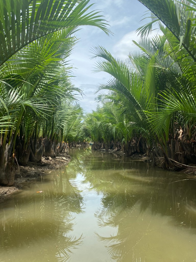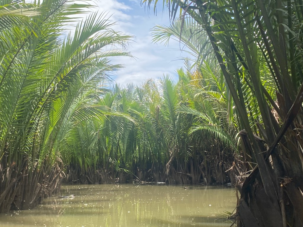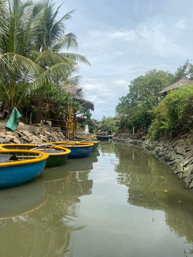 Puis, nous embarquons pour une balade à bord d’une barque de bambou tressé en forme de coquille au milieu des cocotiers d’eaux.