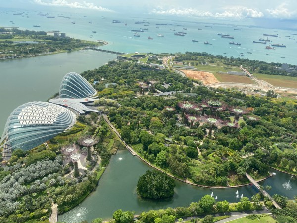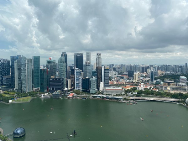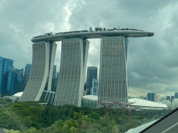 Je prends le métro pour me rendre vers l’hôtel Marina Bay Sands. J’y prends un ascenseur pour me rendre au 56ème étage, on y a une vue superbe sur le centre ville. On se trouve à l’avant du bateau.