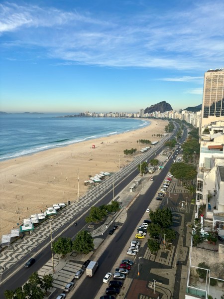 Je monte au 19ème étage de l’hôtel : d’un côté la plage de Copacabana