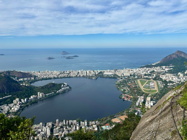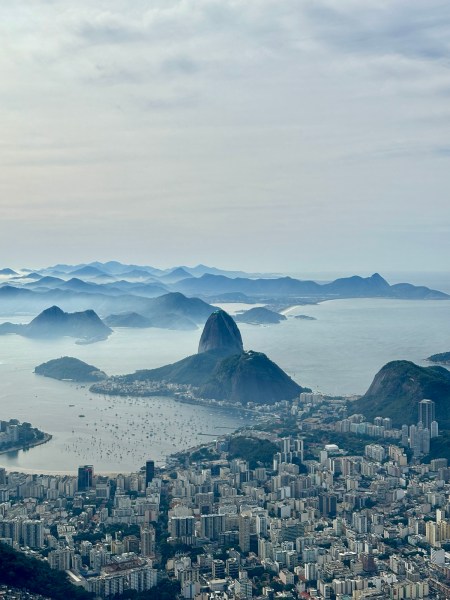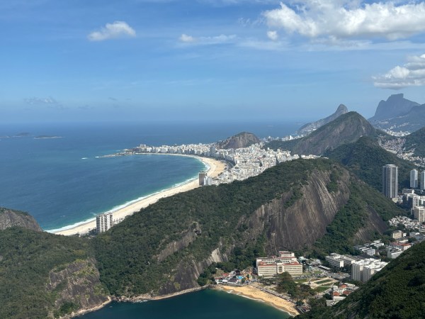 On commence par le Corcovado (« bossu » en portugais) est l’un des nombreux reliefs de la ville de Rio de Janeiro. Il s’élève à 704 mètres d’altitude. Il est célèbre pour accueillir en son sommet la statue du Christ Rédempteur, l’un des principaux symboles de la ville et du pays, et pour offrir une vue sur l’ensemble de la zone sud de la ville.