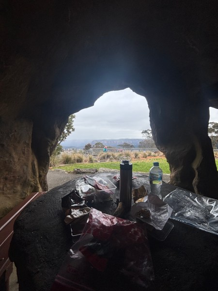 Pique Nique dans une sorte de “grotte”, bonne idée car il commence à pleuvoir.