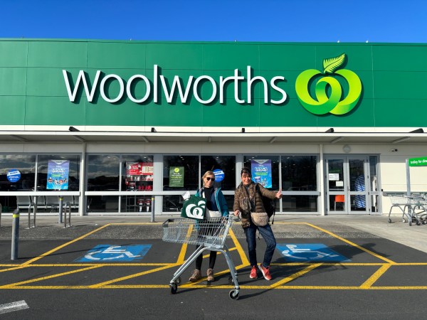 Plein d’essence pour la première fois, pas hyper simple. Puis on passe faire des courses dans notre supermarché marché favori : Woolworth.