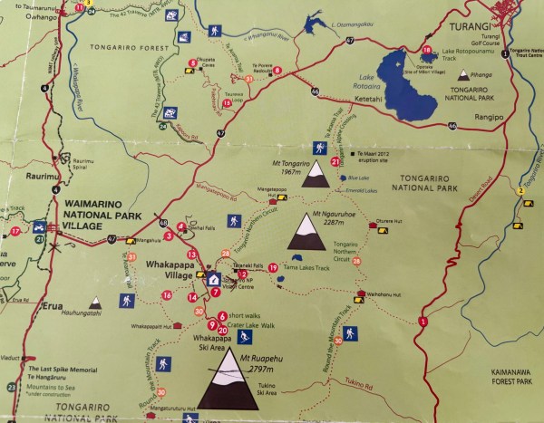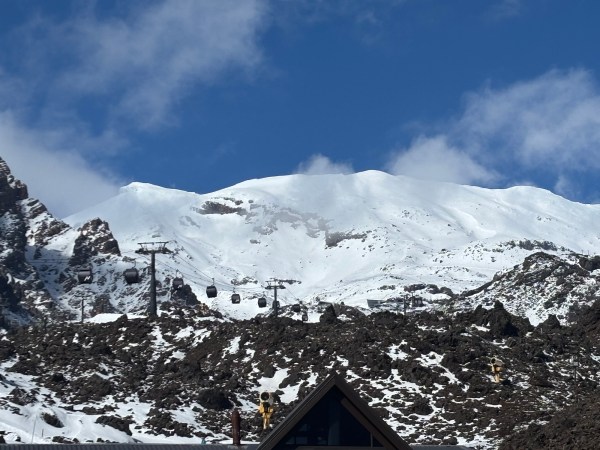 Puis nous prenons la voiture jusqu’aux pieds du mont Ruapehu (2797m) – Whakapapa Village – où nous pourrions skier (si on le voulait). D’ailleurs plein de gens le font, c’est la fin de saison mais on peut encore profiter de la neige.