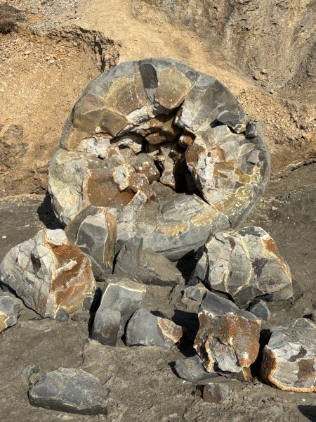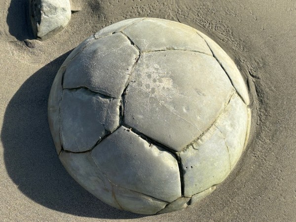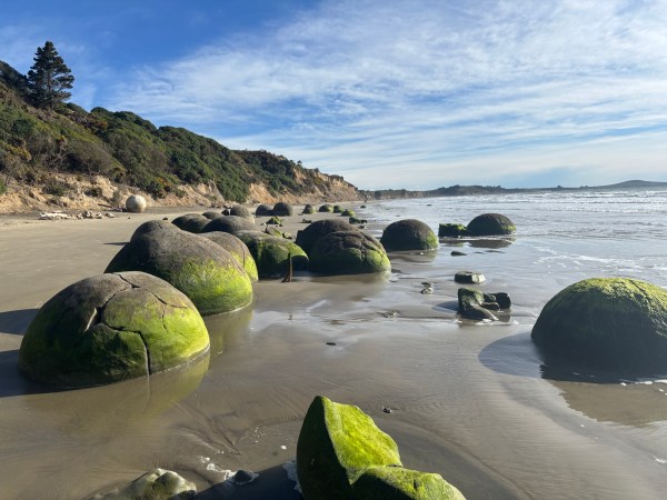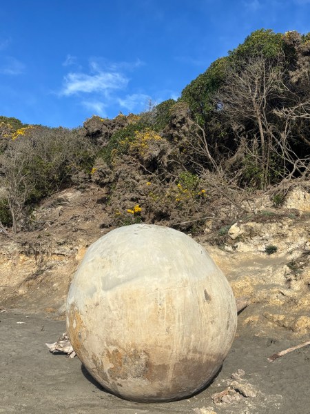 En route, arrêt à Moeraki pour admirer des boulders (rocher en forme de sphère) sur la plage. C’est très spécial. Certains sont intacts, d’autres ont implosé.